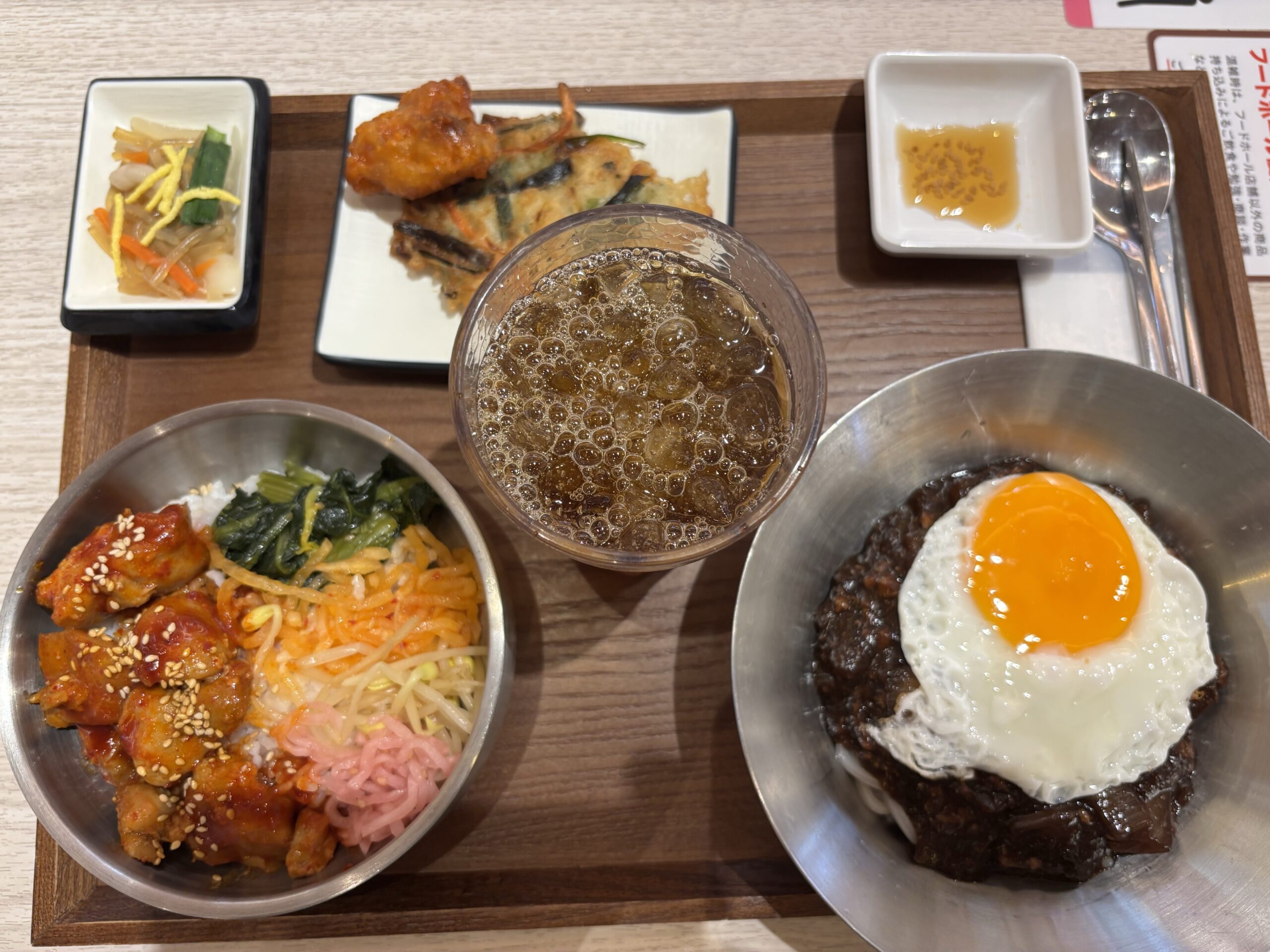 ポチャ定食 ビビンバ風+チャプチェ+チヂミ+ジャジャメン(真ん中は烏龍茶)