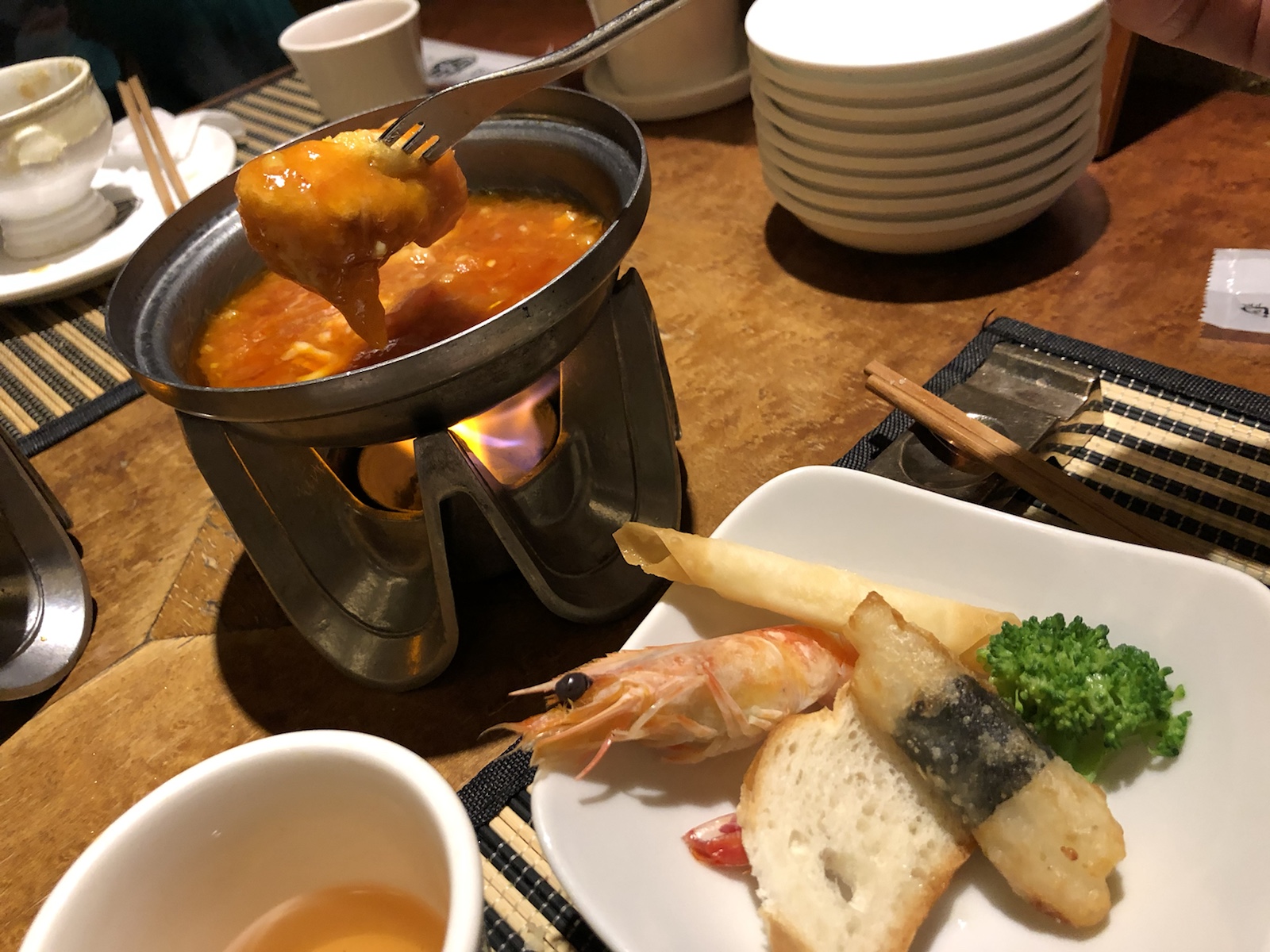 一見、チーズフォンデュですが、実はドラゴンキッチン(クリニックから車で2分)のチリフォンデュです。えびちりソースに具材を絡めていただきました。美味し〜!