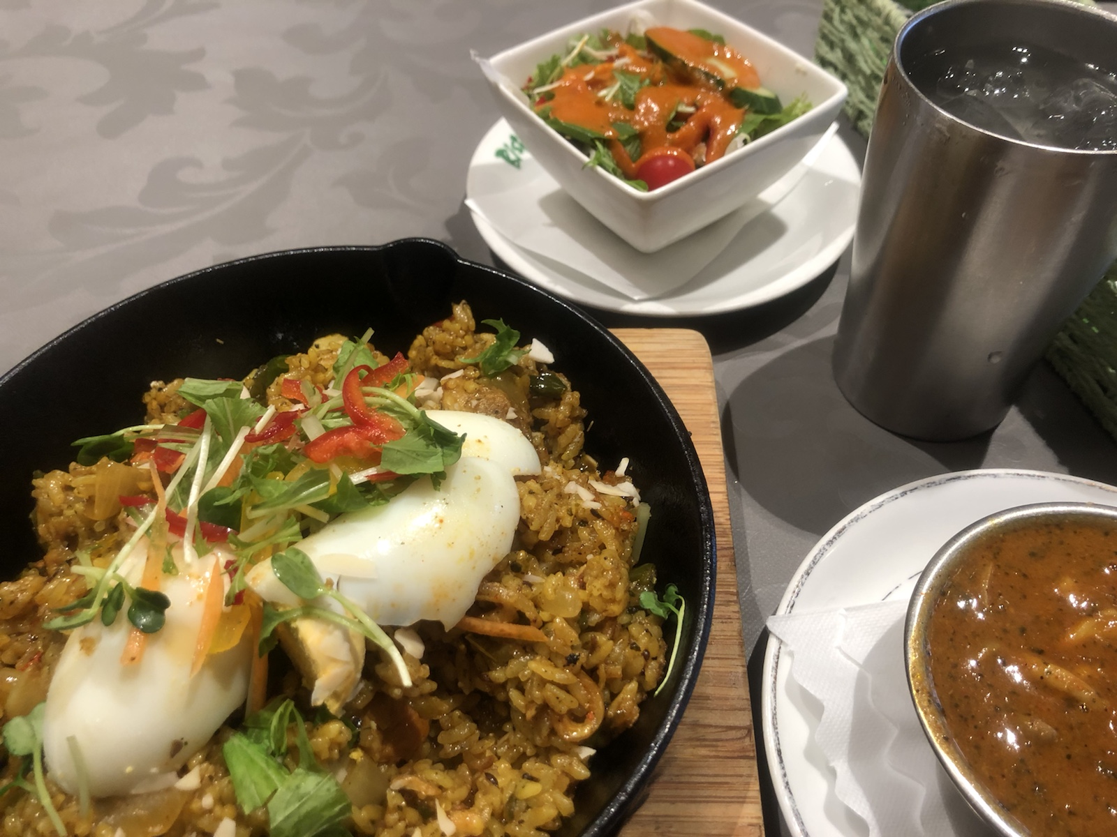 ビリヤニというカレー味の炊き込みご飯。味はカレーチャーハンみたい。 上に温泉たまご。ご飯の下にタンドリーチキンが埋まっていました。店員さんのおすすめは、添えてあるカレーをかけて食べる方法。