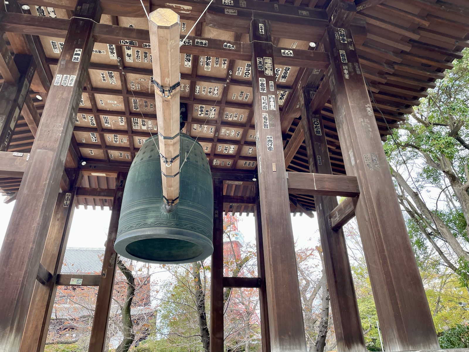 鐘の向こうに東京タワーが見えてます 増上寺