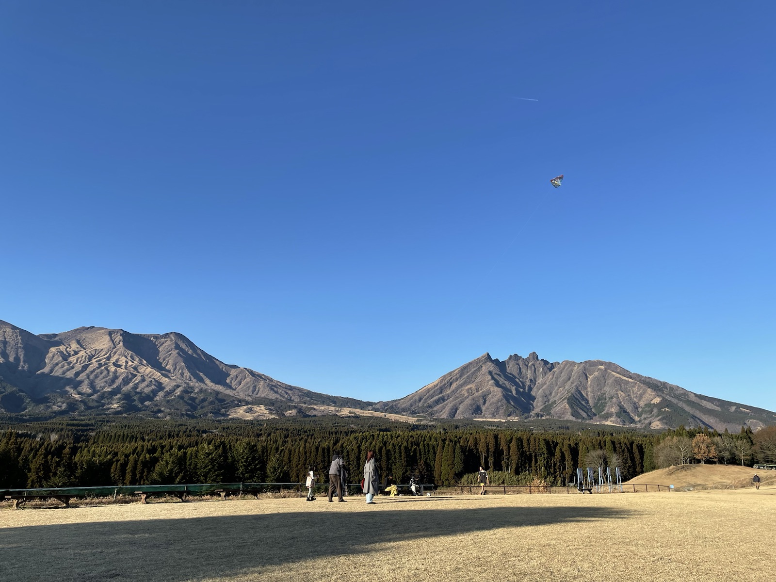 根子岳の前で凧揚げする風景