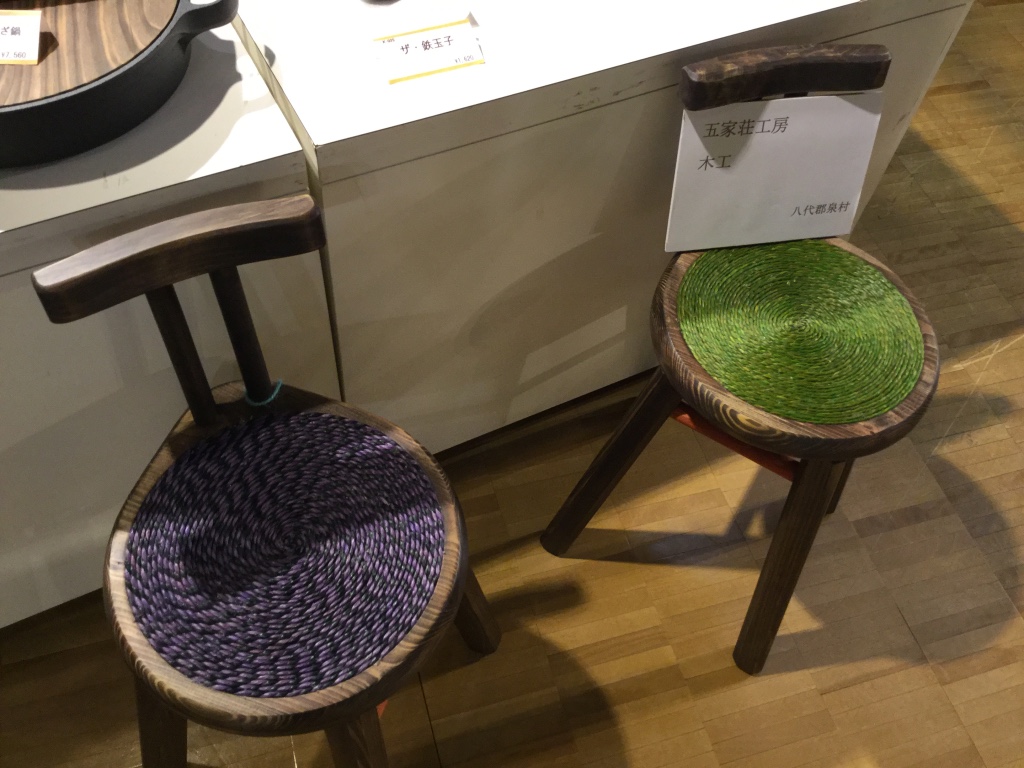 この小さな椅子は五家荘工房という家具工房で作ったスツールです。伝統工芸館に展示されていたのを撮った写真ですが、この椅子を院内のあちこちに配置しています。座り心地いいですよ。