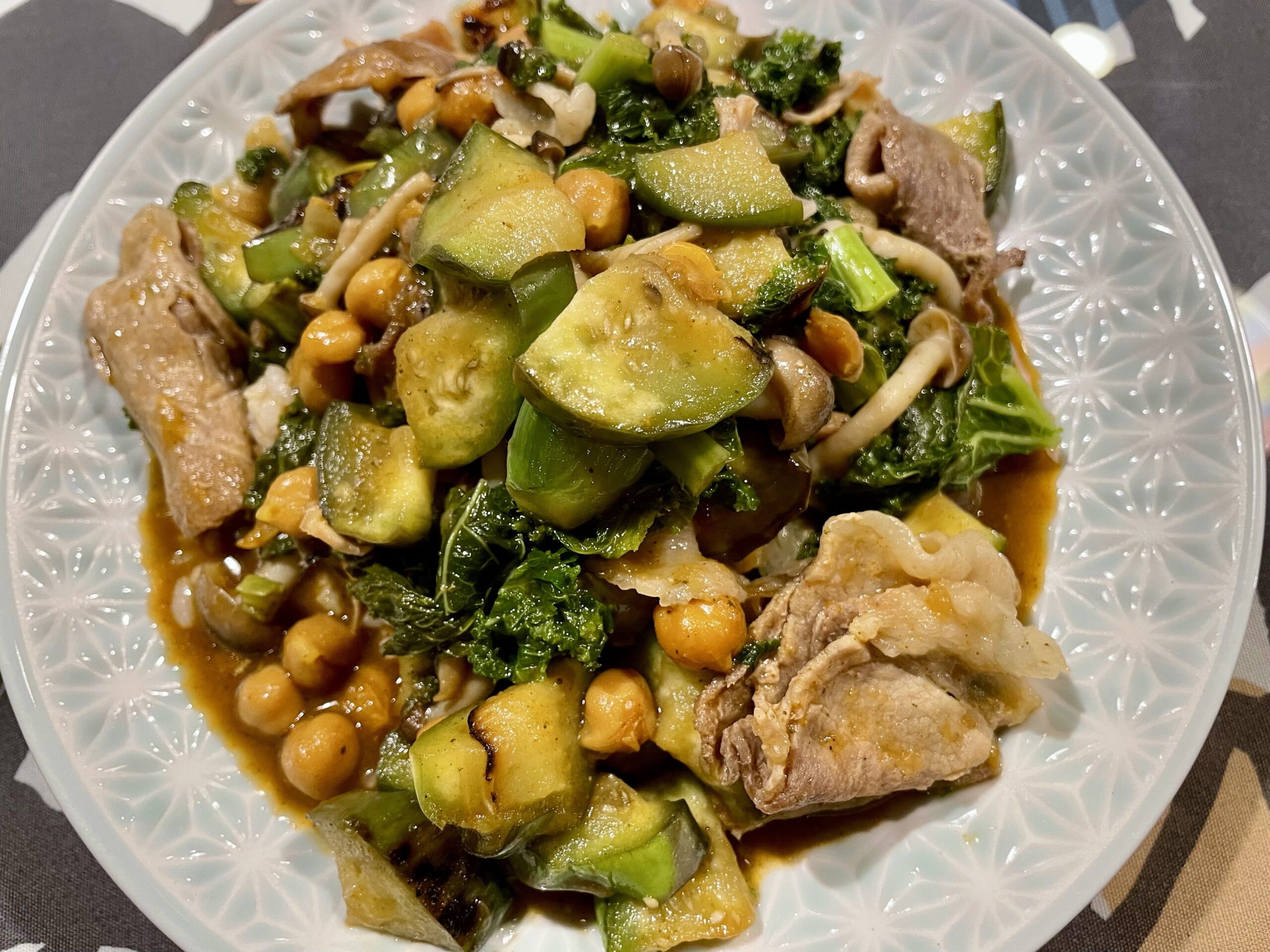 今日はナスとケールとひよこ豆のカレーです。夏はカレーに限ります。ご飯は見えないくらいちょっと。