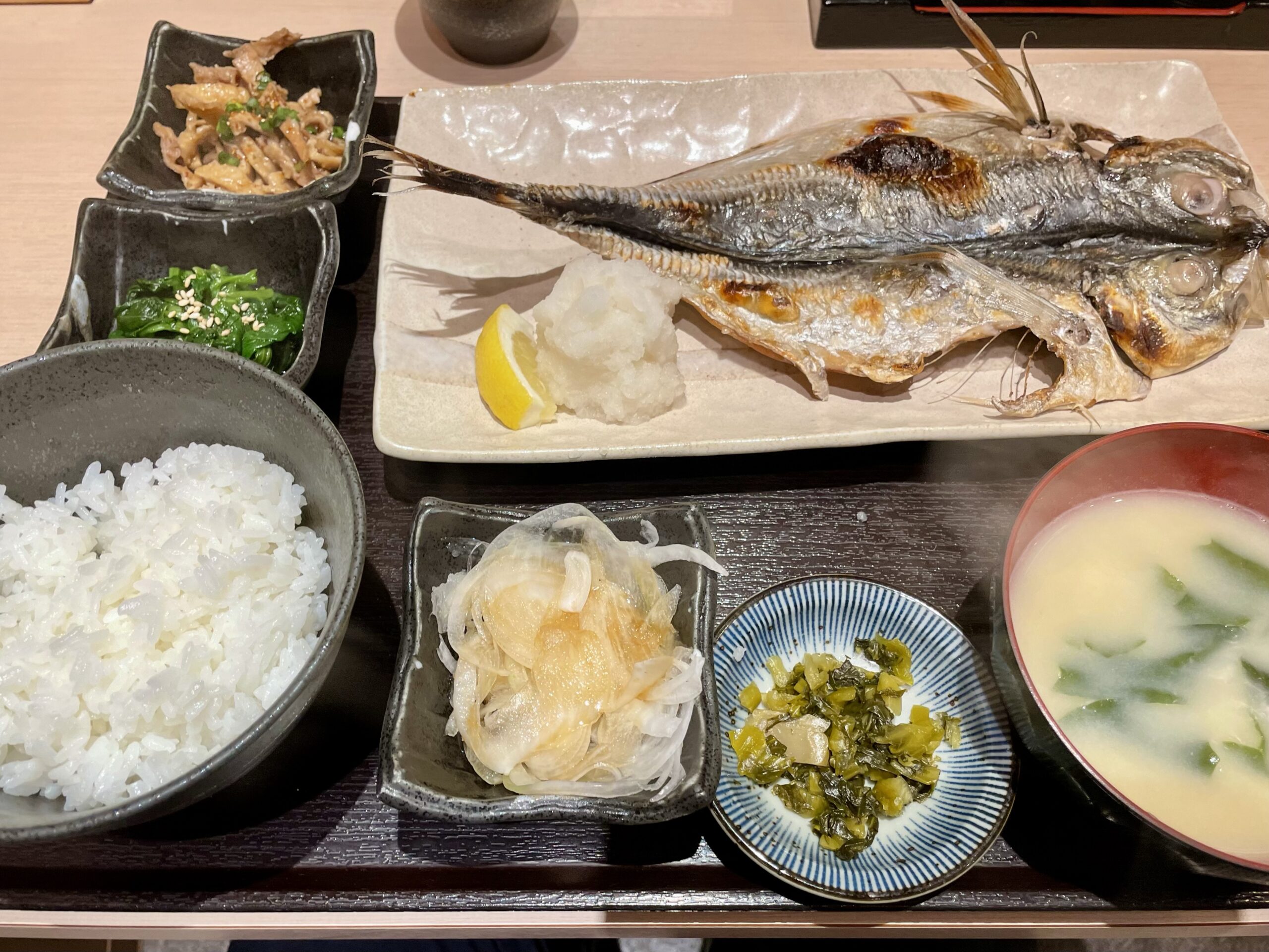 新市街のCoCo壱の2階にある干物の専門店。カウンターに並んでいる干物を選ぶと焼いて定食にしてくれます。写真はアジの干物。美味しかったですよ!