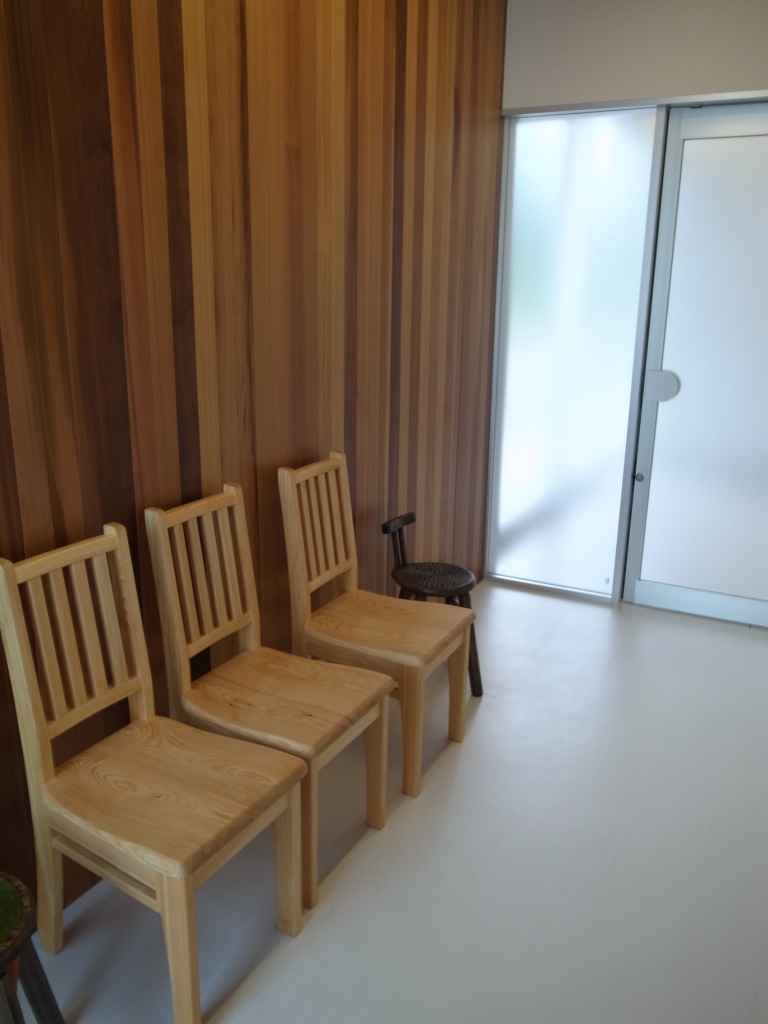 この椅子は五家荘工房で家具大工さんが手作りしてくれたものです。クリニックに6脚買いました。座り心地も良いし、手触りもいいですよ。写真は当院の隔離室です。発熱患者さん用の待合となっています。