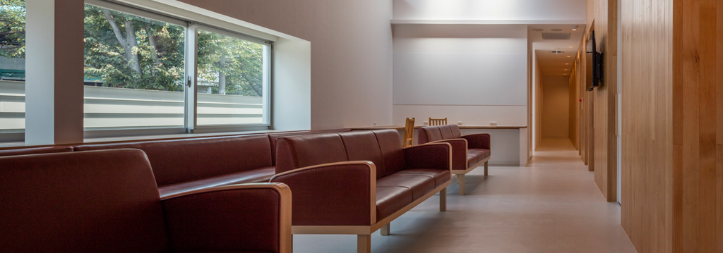 プロカメラマンさんは、三脚を固定し、水平を確認し、構図を取り、何枚か写真を撮ったら、あとはロビーでじっと座っている。何をしているのかなーと思ったら、もう少し日が西に傾いて、建物全体に光が当たるのを待っています、とのこと。そう、建築写真というのは、太陽との相談なのだ。僕も写真を撮るのは朝か夕方が多い。昼の強い日差しの中では明るいところは明るすぎるし、影も強く出てコントラストがありすぎる。夕方、夕日の差し込む建物の中はキラキラと輝きを増す。そして、日が暮れると建物全体を照らす街灯やクリニックの看板を照らす照明の影響で、さらに建物の雰囲気が変わってくる。その時間帯を狙って写真を撮るのがプロなんですね。