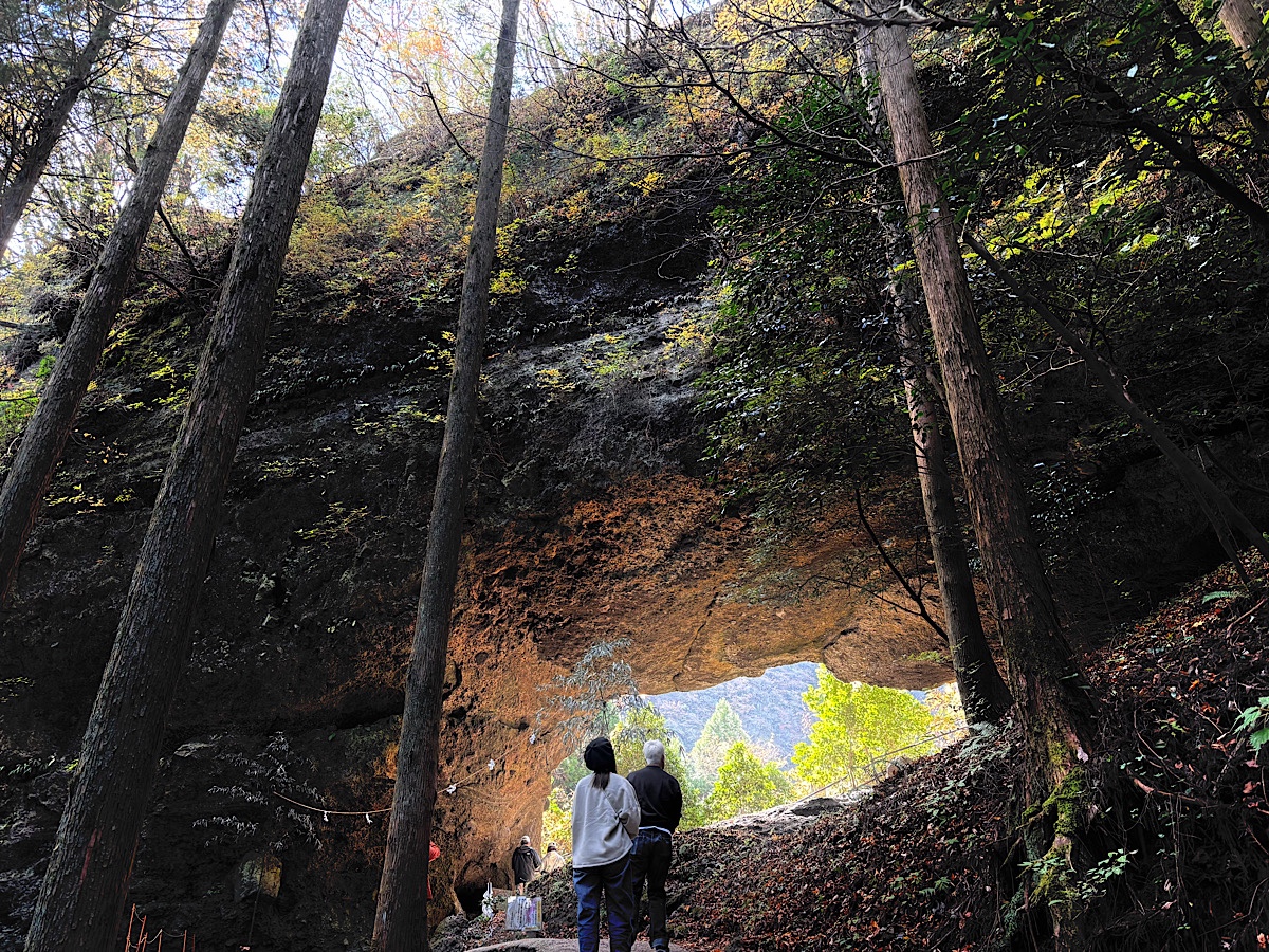 昼までまだ時間が早かったので、さらに国民休暇村の通りを北の方まで行ってみることにしました。根子岳がよく見える場所まで行くと、すごい人だかりがありました。何だろうと思って駐車場に入ってみたところ、「上色見熊野座神社」と書かれた看板がありました。聞いたことあります!ここはパワースポットとして有名な神社です!吸い寄せられるようにふらっと立ち寄っただけですが、まるで神様に呼ばれたような気がしました。急な階段を息を切らして登ると、社殿の奥には大きな岩があり、窓のような穴が空いていました。その奥から朝日がキラキラと輝いています。こんな素晴らしい場所に来られて本当に良かったと感じ、天からのパワーをいただいたような気分になりました。