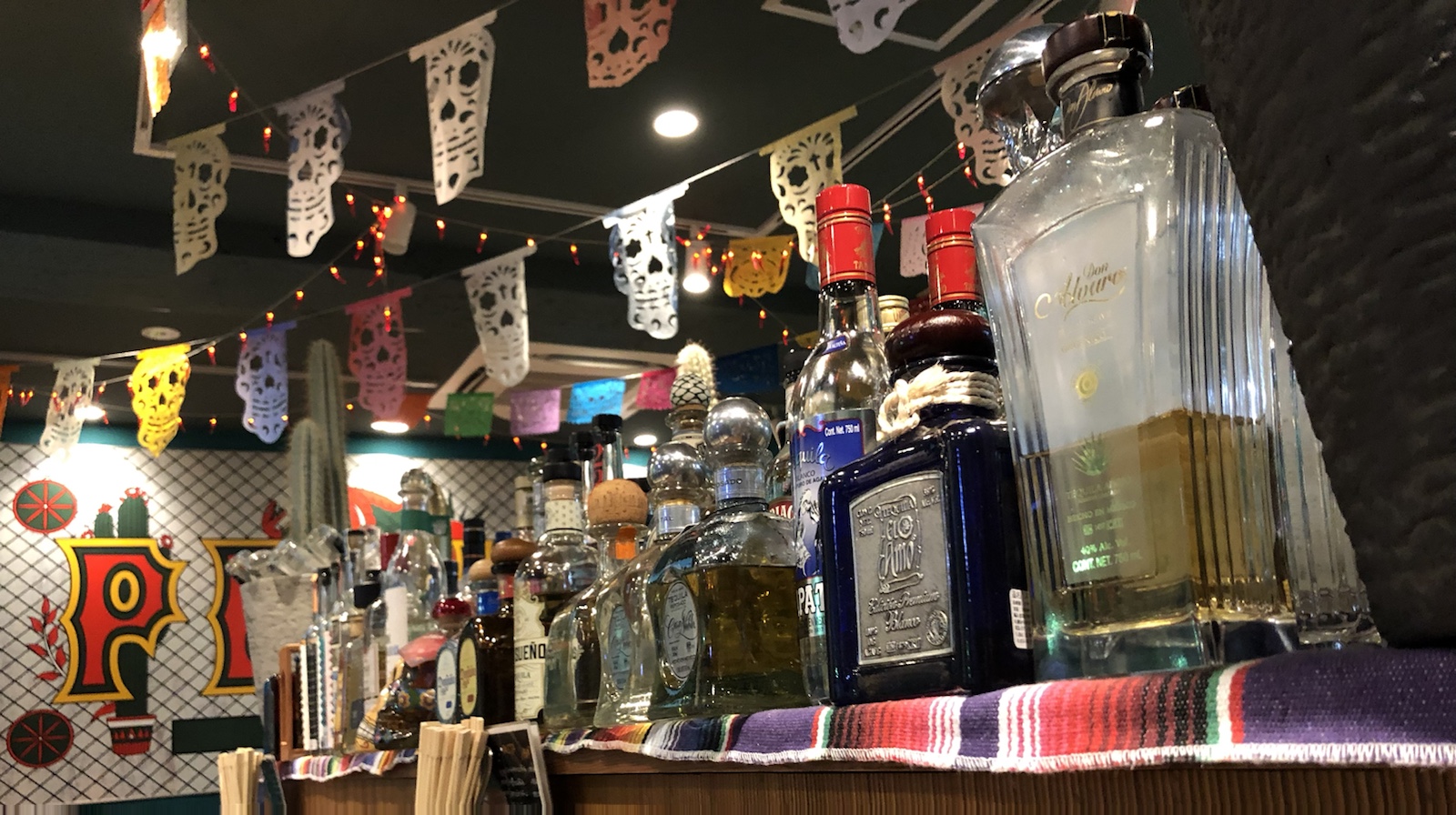 メキシコ料理PELAO(下通り) テキーラがカウンターに並んでいます