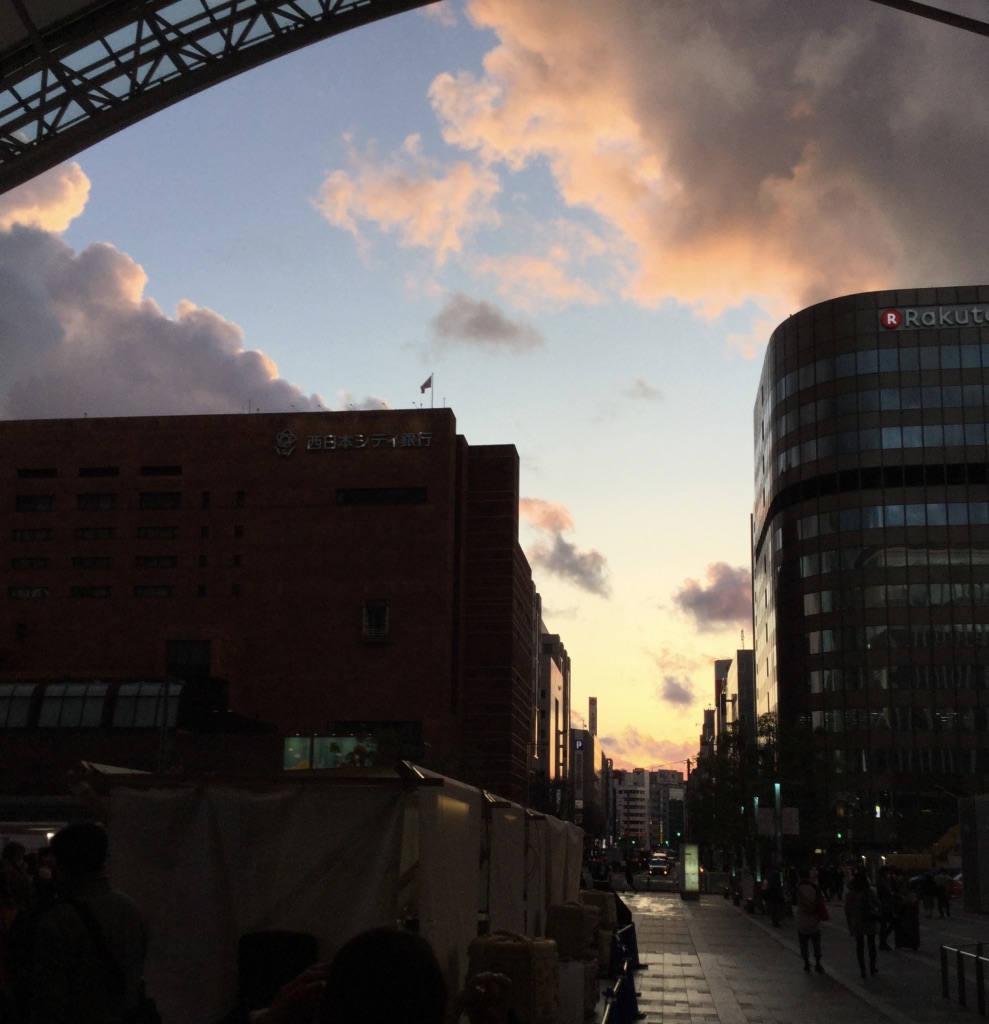 博多駅前の夕日です。正面が陥没した道路です。